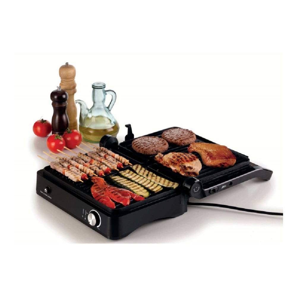 - Per grigliate miste di carne, verdure e pesce senza fumo e odori sgradevoli. Con 3 tipi di cottura: a contatto, a fornetto e a libro aperto fino a 180°C. Temperatura regolabile e griglie antiaderenti removibili