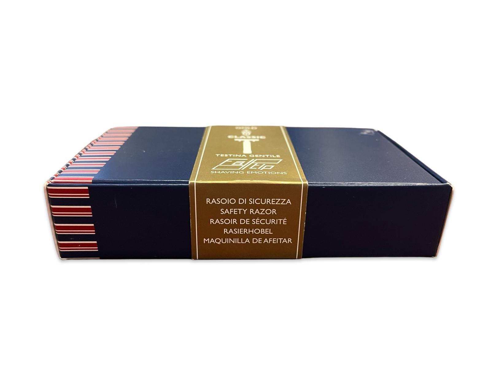 l Fatip Gold Classic Gentile è un rasoio di sicurezza in 3 pezzi contraddistinto dal classico disegno del manico a colonna ionica che si interrompe con lelegante base zigrinata che facilita lapertura a vite della testina. E realizzato totalmente in ottone e poi sottoposto al processo di finitura metallica. Il rasoio è perfettamente bilanciato e facile da utilizzare.