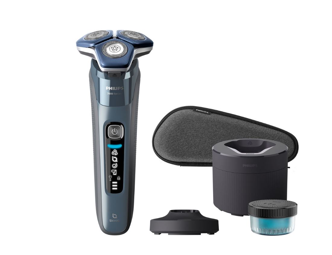 - Philips S7000 – Rasoio elettrico Wet & Dry con 1 rifinitore a scomparsa, regolabarba, custodia da viaggio, Quick Clean Pod e supporto di ricarica (modello S7882/54). Pelle liscia: scopri in che modo S7000 con tecnologia SkinIQ scorre perfettamente sulla pelle, tagliando i peli con precisione grazie alle 45 lame autoaffilanti SteelPrecision, anche su una barba di 3 giorni. Progettato per durare a lungo: con una durata del motore e della batteria di 7 anni e una durata delle lame in acciaio autoaffilanti di 2 anni, il rasoio sarà come nuovo ogni giorno. Rimuove più peli a ogni passata*: le 45 lame autoaffilanti SteelPrecision si muovono fino a 90.000 volte al minuto per una rasatura accurata ed efficace. Riduce l’attrito: tra le testine del rasoio e la tua pelle è presente un rivestimento protettivo che riduce al minimo le irritazioni fino al 30%** grazie alle 250.000 microsfere per centimetro quadrato. Contatto ottimale con la pelle: testine completamente flessibili che ruotano a 360 gradi per seguire i contorni del viso e garantire una rasatura accurata e confortevole. Il set include: 1 rasoio elettrico Philips Series 7000 Wet & Dry, 1 regolabarba integrato, 1 base di ricarica, 1 capsula Quick Clean con 1 cartuccia, 1 regolabarba, 1 custodia morbida da viaggio e 1 cavo di ricarica USB-A per una comoda ricarica in movimento, compatibile con tutti gli adattatori di alimentazione USB