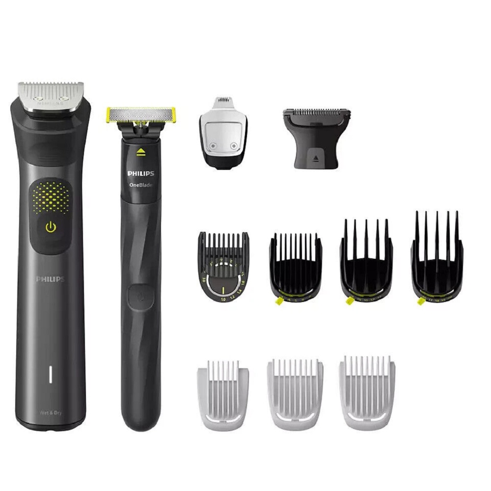 - 13 accessori: rifinitore in acciaio, rifinitore di precisione in acciaio, rasoio per il corpo con protezione per la pelle, lama OneBlade, pettine di precisione, pettine regolabile da 3-7 mm, pettine regolabile da 9-13 mm, pettine regolabile da 16-20 mm, 2 pettini per il corpo, pettine per sopracciglia