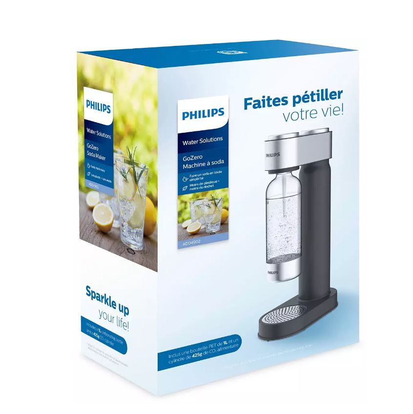 - Include una bottiglia da 1 L senza BPA e un cilindro di CO2 per un massimo di 60 litri di acqua frizzante a seconda del livello di carbonazione